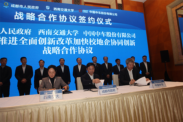 2月26日,成都市人民政府、西南交通大学、中国中车股份有限公司在蓉举行签约仪式,签署深入推进全面创新改革加快校地企协同创新战略合作协议。