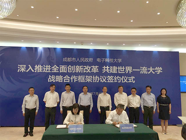 7月4日下午,成都市人民政府与电子科技大学举行《深入推进全面创新改革 共建世界一流大学》战略合作框架协议签约仪式。中国工程院院士、电子科技大学校长李言荣,市委副书记、市长唐良智出席签约仪式并致辞。